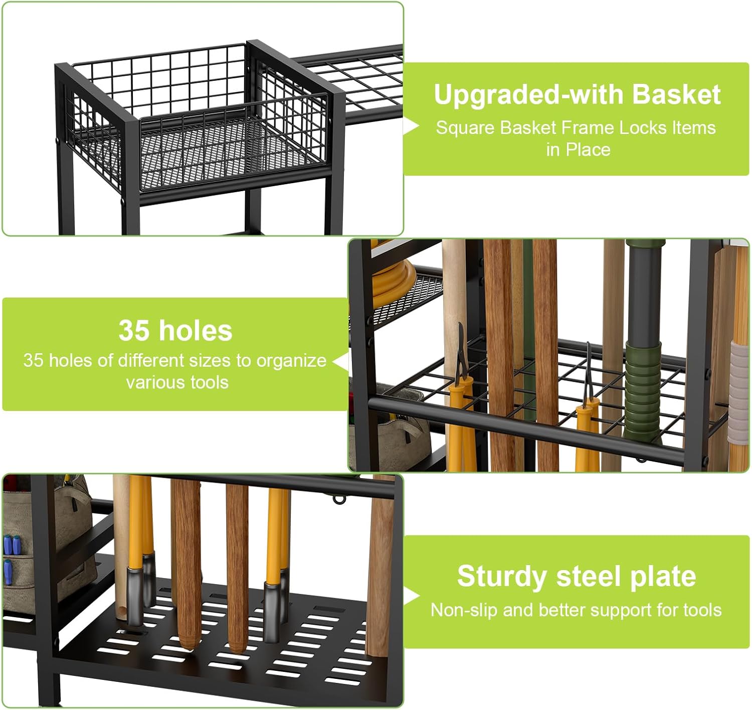 - Top with Basket : This gardening tool rack comes with a storage basket on the top to lock small tools/cleaning supplies/water bottle odds and ends securely in place so they won’t fall off. Also, designing the basket at the top makes it easy to reach and store.